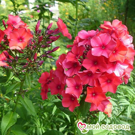 Душистые гроздья соцветий лососево-оранжевого цвета с маленькой бордовой серединкой полностью соответствуют своему названию Оранж Перфекшен – солнечно-оранжевое совершенство. Несомненно, эти яркие цветы, благодаря контрасту с зеленью листьев, привлекут к себе внимание и станут ярким украшением в любом саду. Orange Perfection цветет довольно продолжительно в июле-августе. Купить саженцы флокса Оранж Перфекшен стоит для оформления миксбордеров и цветников, сорт великолепно смотрится рядом с монардами, тысячелистниками, дельфиниумами, лилейниками. Сорт неприхотлив и морозостоек, на зиму побеги обрезают на высоту 10 см. Как выглядит растение? Куст прямостоячий, густо облиственный, высотой до 100 см. Растение способно стремительно разрастаться. Побеги прочные, но под весом раскрывающихся соцветий слегка поникают. Цветение начинается в конце июля — первой половине августа. Окраска бутонов необычная – пурпурно-коричневая. Распустившиеся цветки белоснежные, а трубка розового цвета. Вместе они образуют крупное соцветие пирамидальной формы. Применение в ландшафтном дизайне Сорт выращивают на втором плане клумб и миксбордеров. Многолетник хорошо сочетается с лилиями, лилейниками и древовидными пионами с темной окраской лепестков. Флористы добавляют цветок в букетные композиции. Советы по посадке и выращиванию Для растения подходит как солнечно, так и слега затененное место. Жизнь хрупких цветков можно продлить, если обеспечить им защиту от резких порывов ветра. Декоративные качества многолетника раскрываются лучшим образом в плодородной, рыхлой и умеренно влажной земле. При посадке важно, чтобы почки находились на 2 см ниже уровня поверхности грунта. Лунки готовят размером 30 х 30 см. Внутрь насыпают компост, торф и песок. В слишком легкую почву добавляют глину – она поможет удерживать влагу. Корни саженца расправляют и засыпают почвосмесью. Купить недорого флоксы можно в интернет-магазине «Мой садовод». Просто отправьте понравившийся сорт в корзину, нажав на соответствующую кнопку. Мы бережно упакуем и максимально быстро доставим Вашу покупку ТК СДЭК или почтой России. Если возникнут вопросы или сложности с оформлением заказа, наши консультанты предоставят квалифицированную помощь. Мы гарантируем высокое качество посадочного материала и дорожим мнением каждого покупателя!